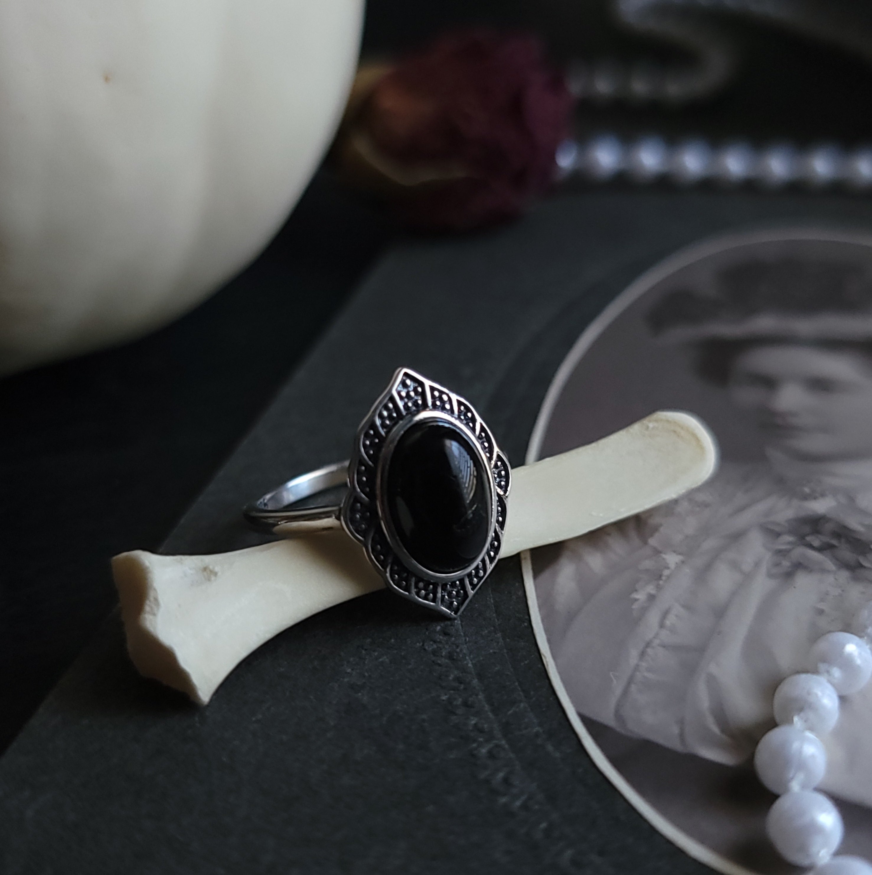 Morrigan - Black Agate Marquise Ring - Sterling Silver Ring